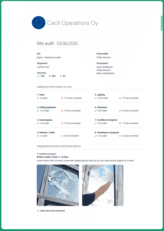 Toteuta tarkastukset ja turvallisuuskävelyt kentällä työkalulla, joka toimii myös alihankkijoilla ja kumppaneilla. Välitä havainnot ja poikkeamat käsittelijöille vaikka kesken kierroksen.